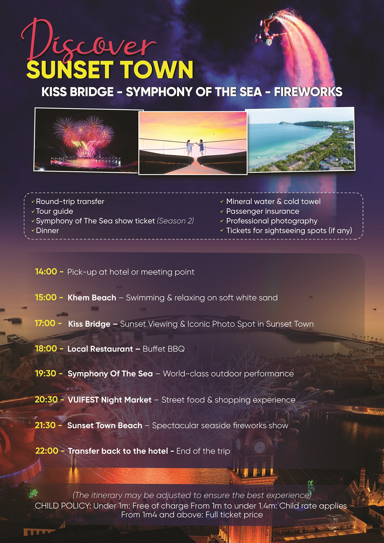 21:30: Move to Sunset Town Beach to admire the dazzling fireworks display reflected on the sea under enchanting background music.