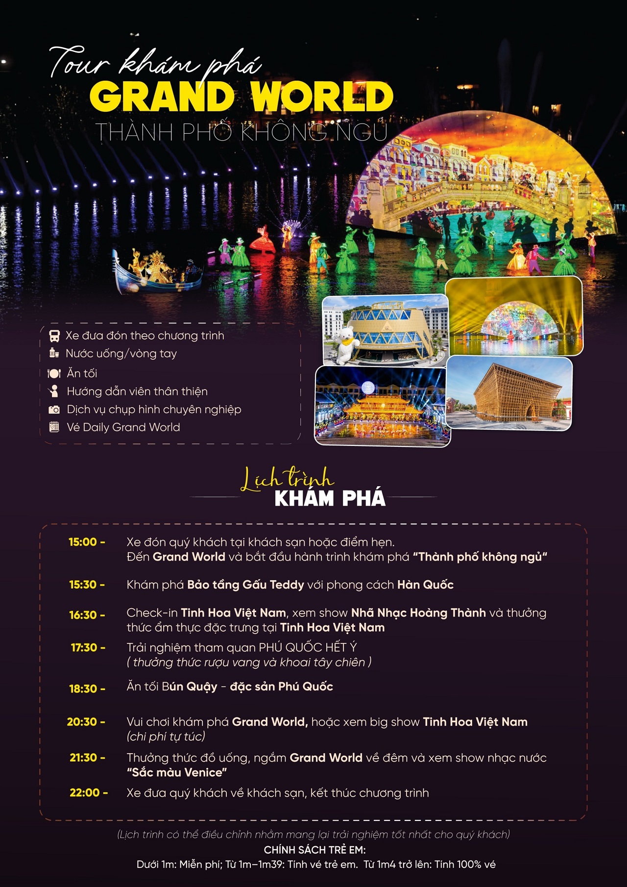 Tour Grand World 1 ngày sẽ cùng bạn khám phá thành phố không ngủ, đắm chìm vào xứ sở Châu Âu giữa lòng Đảo ngọc với không khí lễ hội sôi động cùng các trải nghiệm: