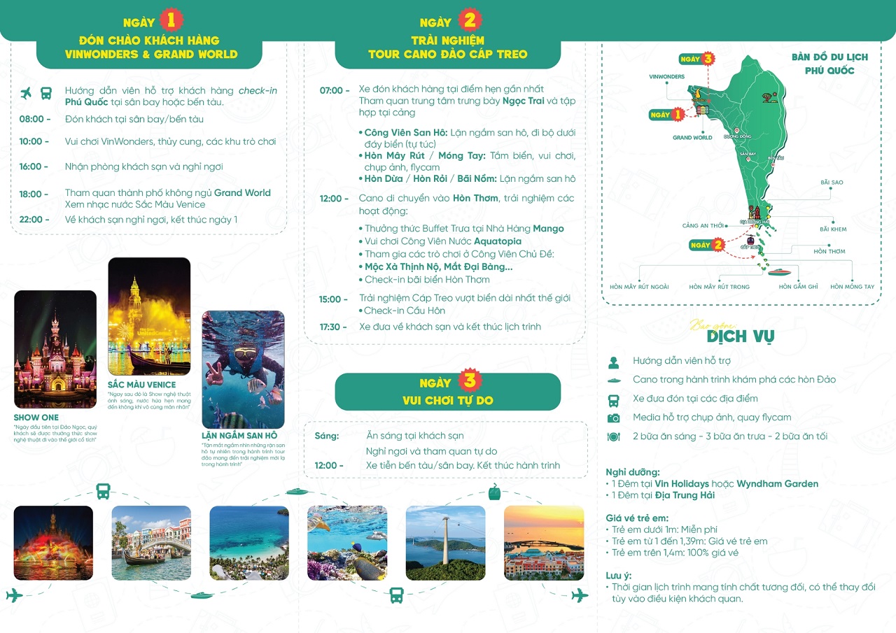 Lịch trình hấp dẫn: VinWonders, Grand World, tour cano 3 đảo, Cáp treo,…